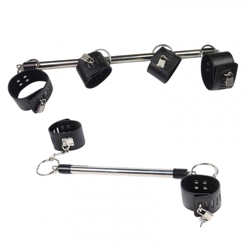 Experimenta nuevas sensaciones con nuestro set de sujeción con barras de acero inoxidable. Cada barra mide 50 cm y 30 cm, perfectas para unir pies y manos o manos solamente. El kit incluye 4 esposas ajustables, 4 candados y 2 barras para una experiencia de sumisión sin igual. ¡Siente el poder de la pasión!
